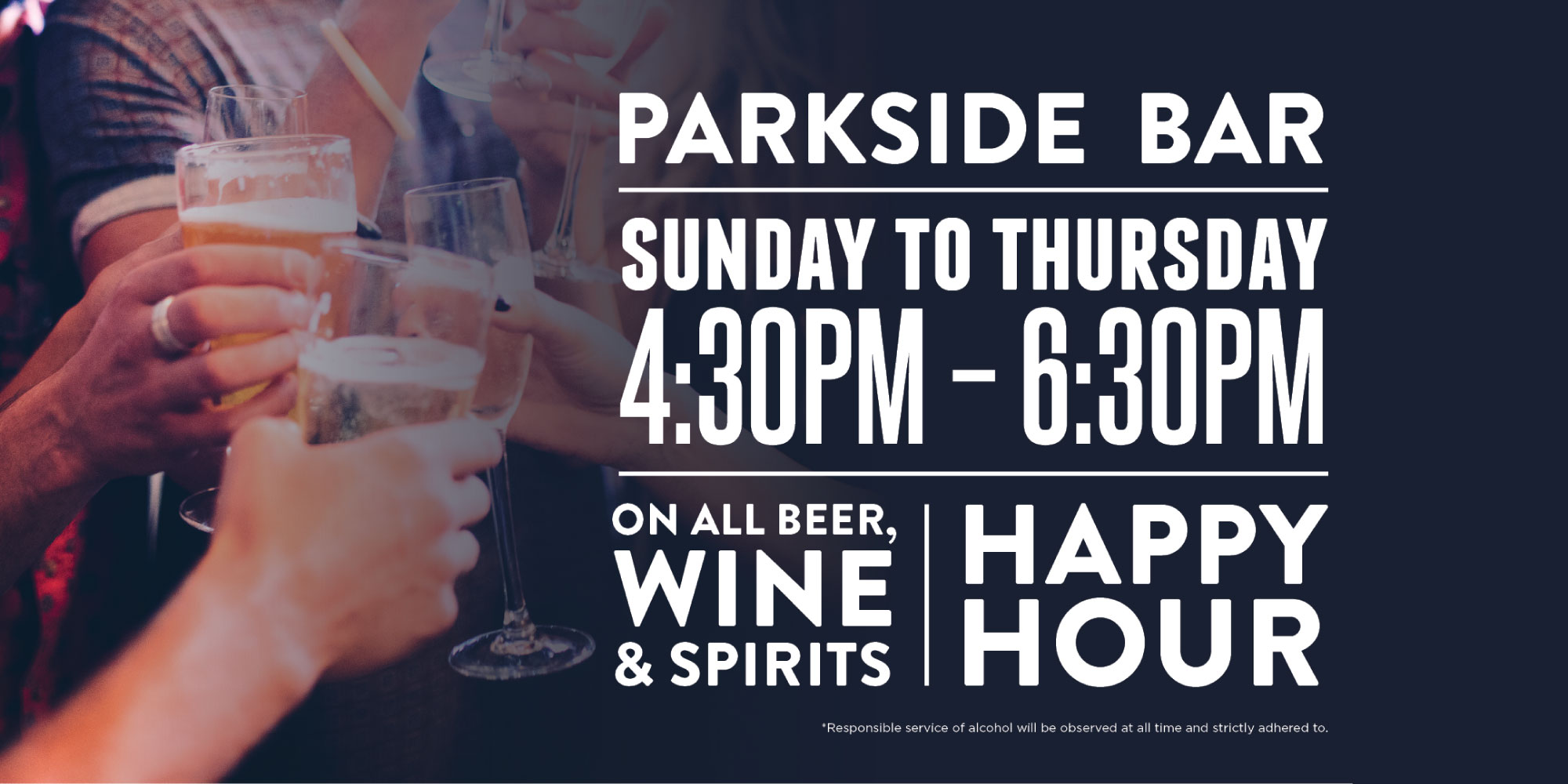 *Responsible service of alcohol will be observed at all times and strictly adhered to. Happy Hour promotion excludes public holidays and special event days, unless otherwise specified.